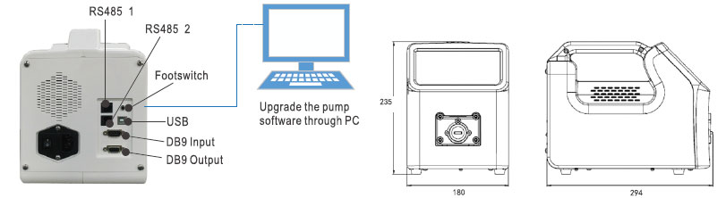 Máy bơm có thể được điều khiển thông qua màn hình cảm ứng, công tắc chân, tín hiệu tương tự và giao tiếp, kết hợp với nhiều loại giao diện (USB, RJ11, DB9, v.v.) để kết nối hệ thống dễ dàng